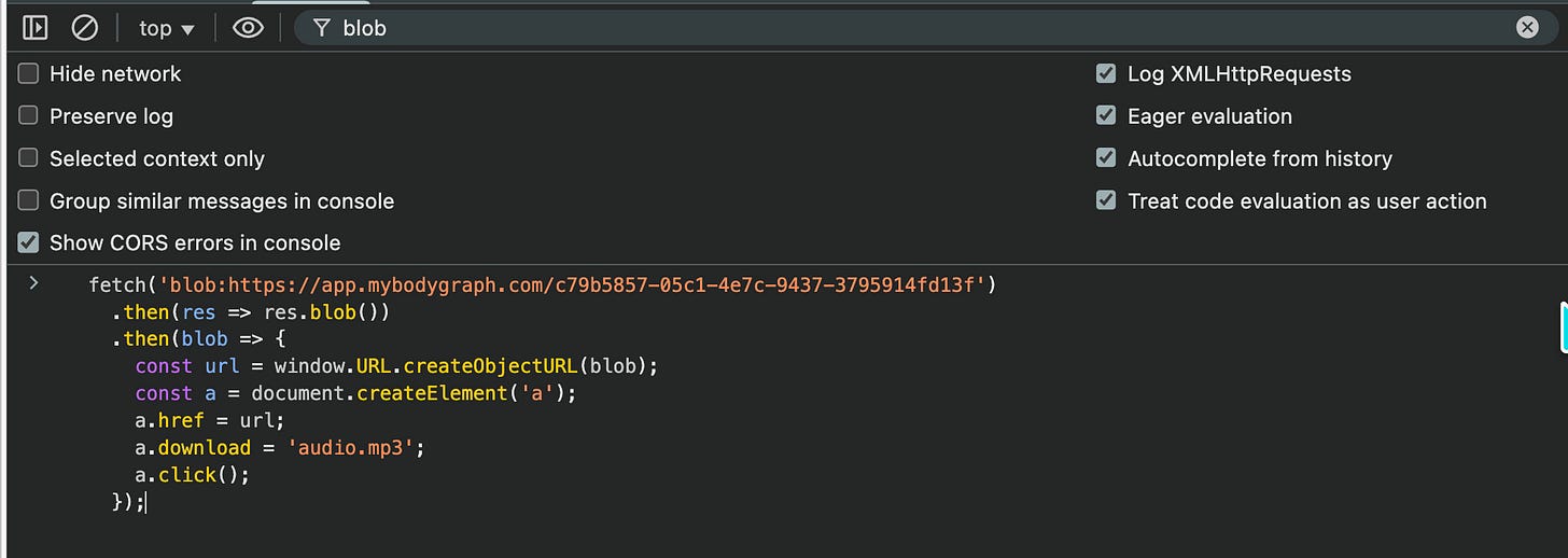 Klick drauf → der Code läuft auf der aktuellen Seite → findet automatisch alle Audio/Video Blob-URLs → auch im versteckten Shadow DOM → zeigt dir eine Liste → Download. Fertig.