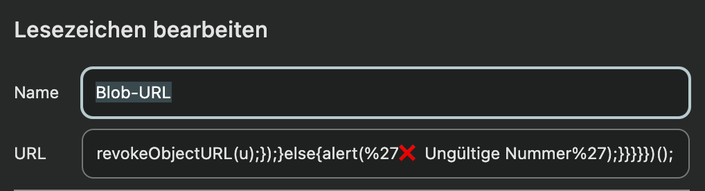 javascript:(function(){const blobs=[];document.querySelectorAll(’audio,video’).forEach(el=>{if(el.src&&el.src.startsWith(’blob:’))blobs.push({type:’Audio/Video’,url:el.src})});document.querySelectorAll(’*’).forEach(el=>{if(el.shadowRoot){el.shadowRoot.querySelectorAll(’audio,video’).forEach(se=>{if(se.src&&se.src.startsWith(’blob:’))blobs.push({type:’Shadow DOM’,url:se.src})})}});if(blobs.length===0){alert(’❌ Keine Audio/Video Blobs gefunden!’);}else if(blobs.length===1){fetch(blobs[0].url).then(r=>r.blob()).then(b=>{const u=URL.createObjectURL(b);const a=document.createElement(’a’);a.href=u;a.download=’audio-’+Date.now()+’.mp3’;a.click();URL.revokeObjectURL(u);alert(’✅ Download gestartet!’);});}else{const list=blobs.map((b,i)=>`${i+1}. ${b.type}`).join(’\n’);const choice=prompt(`✅ ${blobs.length} Audio/Video gefunden:\n\n${list}\n\nWelche Nummer? (oder “all”)`);if(choice){if(choice.toLowerCase()===’all’){blobs.forEach((b,i)=>{setTimeout(()=>{fetch(b.url).then(r=>r.blob()).then(bl=>{const u=URL.createObjectURL(bl);const a=document.createElement(’a’);a.href=u;a.download=’audio-’+(i+1)+’-’+Date.now()+’.mp3’;a.click();URL.revokeObjectURL(u);});},i*500);});}else{const idx=parseInt(choice)-1;if(blobs[idx]){fetch(blobs[idx].url).then(r=>r.blob()).then(b=>{const u=URL.createObjectURL(b);const a=document.createElement(’a’);a.href=u;a.download=’audio-’+Date.now()+’.mp3’;a.click();URL.revokeObjectURL(u);});}}}}}})();Installation: